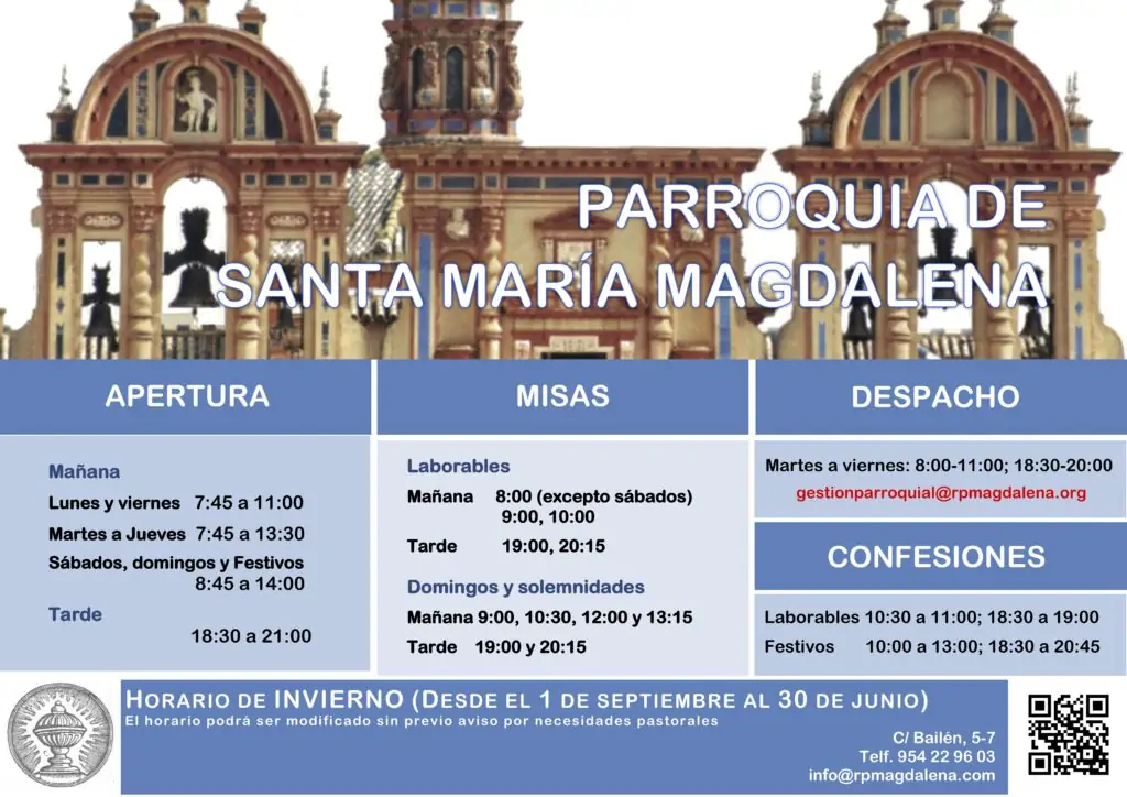 A partir del próximo domingo día 10 de octubre, la misa de 13:00 pasará a ser a las 13:15. En la siguiente imagen se detallan todos los horarios de la Parroquia: