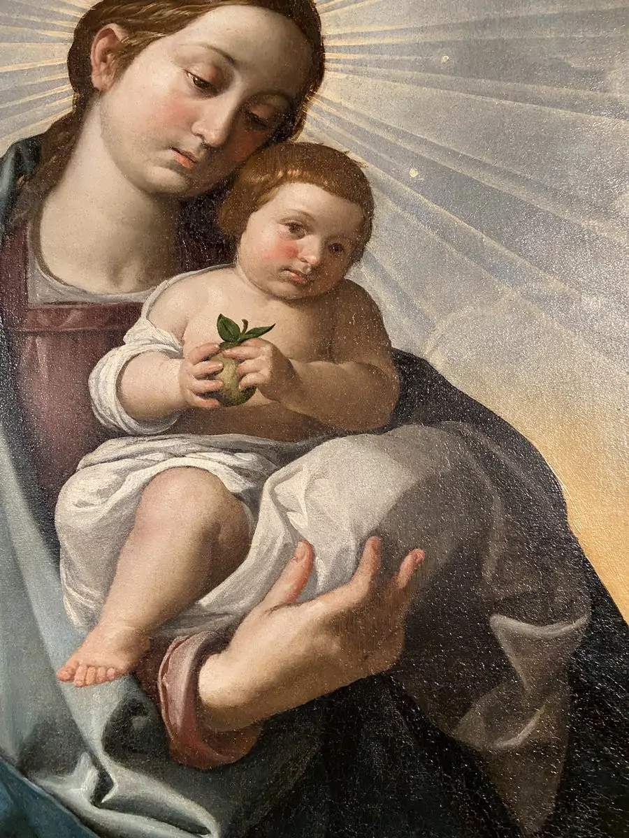 La pintura se adscribe a la representación iconográfica de una joven Virgen María que lleva en brazos al Niño Jesús, ambos inertes e ingrávidos, como flotando en medio de la escena, denotando ella una hermosa mirada cargada de ternura, mientras él observa al espectador, sosteniendo una manzana, identificándole como el nuevo Adán, el Salvador y Redentor del mundo. La escena se ve acompañada según la descripción apocalíptica de San Juan: una mujer vestida de sol, con la luna a sus pies y doce estrellas sobre su cabeza. A ello, se le añaden atributos referentes a las letanías lauretanas: la torre de David, caracterizada como la torre del Oro, las distintas especies arbóreas, el huerto que alude a la virginidad, la fuente de la salud, etc.