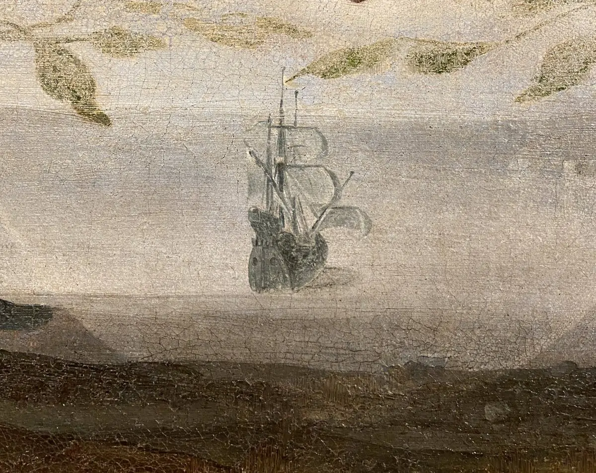 El galeón representa a María como mediadora que lleva a buen puerto a los cristianos, como Madre de la Iglesia. Es la única pieza de la obra con error de perspectiva. ¿Intencionado? Los técnicos atisban a ver cómo las velas y mástiles forman D D V, iniciales presentes en las primeras firmas de Velázquez.