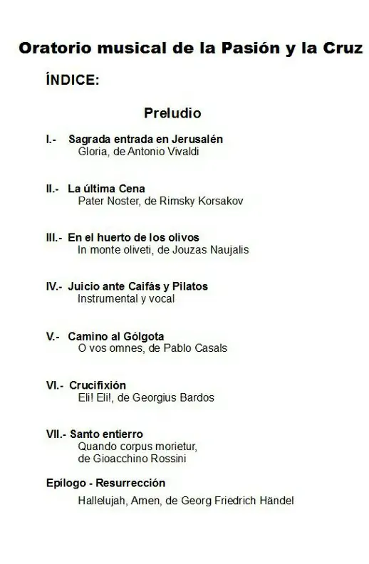 El concierto se compondrá de ocho piezas musicales relacionadas con la Pasión de Cristo. Cada una irá precedida con una narración de pasajes evangélicos desde la Sagrada Entrada en Jerusalén hasta la Resurrección.