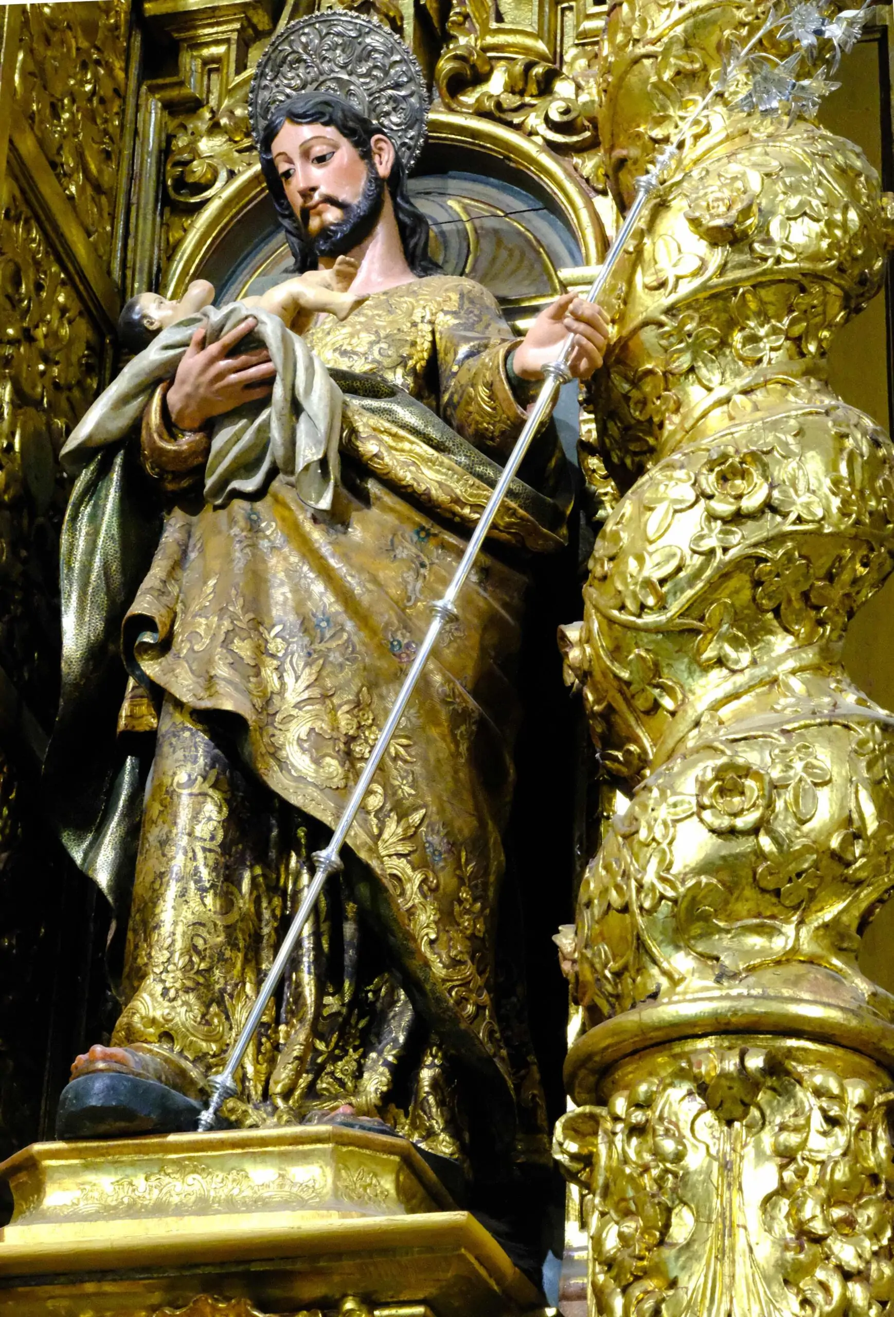 Saint Joseph, with the Child Jesus in his hands and holding the staff of lilies, puts his right foot forward, as a sign that his pilgrimage through life has the Child Jesus as its sole focus.
