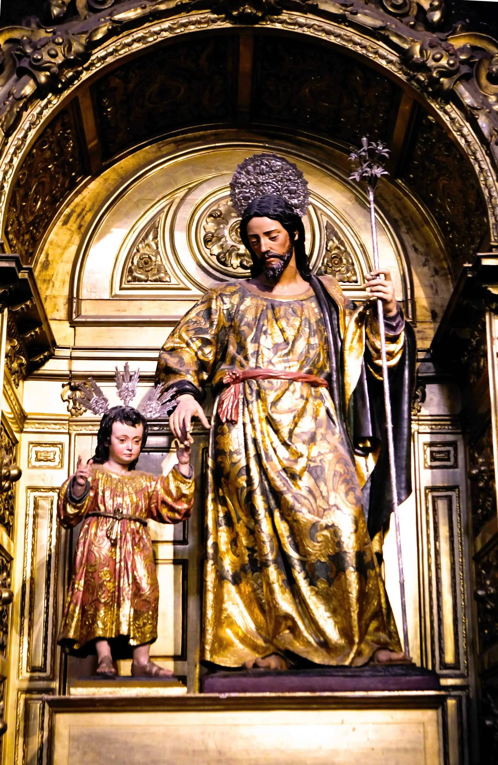 Saint Joseph, with a classicist appearance, focuses his gaze on the Child, showing who is the true protagonist of the couple, and carries the traditional staff of lilies.