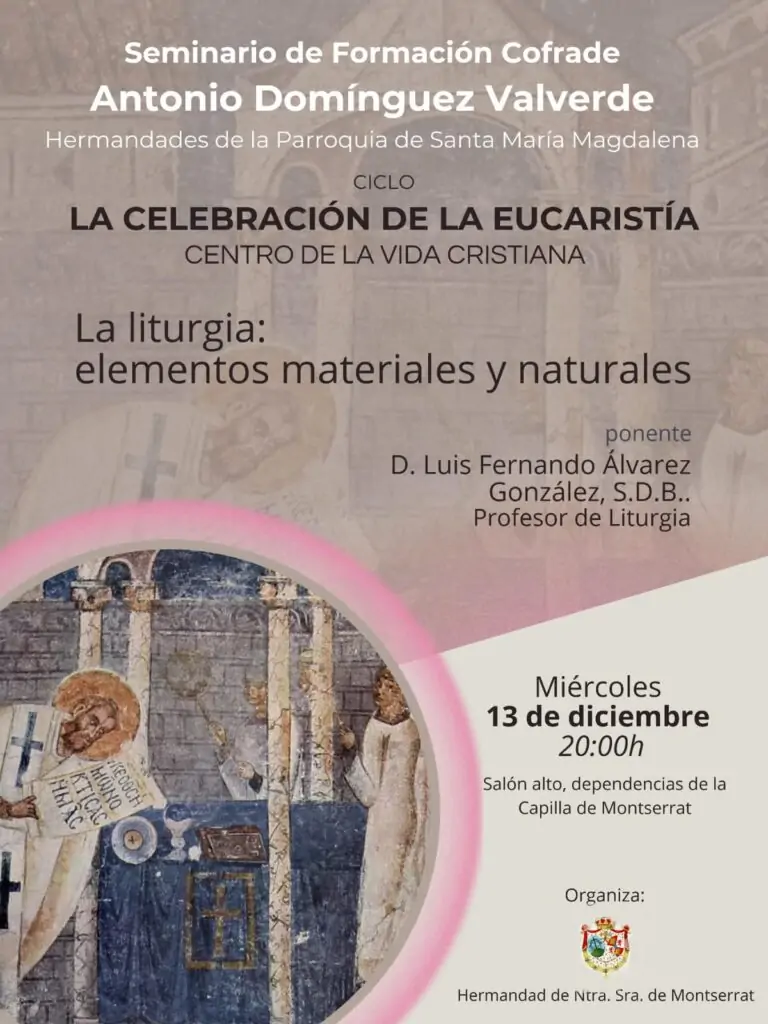 El próximo miércoles 13 de diciembre, a las 20 horas, se celebrará dicha Ponencia en el Salón alto de la Capilla de Montserrat. Se trata de la última convocatoria anual de este seminario conjunto de las Hermandades de la Parroquia de la Magdalena, en este ciclo dedicado a la Celebración de la Eucaristía como centro de la vida cristiana.