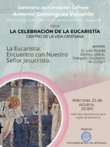 El miércoles 25 de octubre a las 20:0 h tiene lugar la ponencia «La Eucaristía: Encuentro con Nuestro Señor Jesucristo» realizada por don Luis Rueda Gómez, pbtro, Delegado Diocesano de Liturgia. Se enmarca dentro del Seminario de Formación Cofrade Antonio Domínguez Valverde, en el ciclo La Celebración de la Eucaristía, Centro de Vida Cristiana.